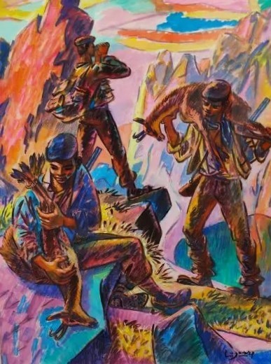 Lagorre a croisé maintes fois les chasseurs dans la montagne, il décide de les représenter, y compris quand ils viennent à croiser des bergers. Avec beaucoup de réalisme, les chasseurs, souvent jeunes, sont peints dans le milieu montagnard et dans l’accoutrement qui leur est propre. Lagorre les saisit sur sa toile en train de charger la bête morte à dos d’homme pour la redescendre dans la vallée, buvant à la régalade après la longue marche poursuite qui vient d’avoir lieu, ou roulant une cigarette en compagnie de bergers croisés en chemin, instant de partage et signes d’amitié.